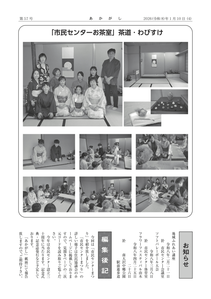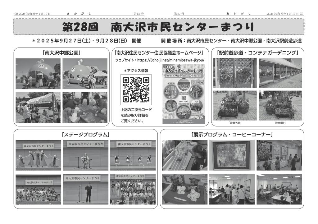 あかがし 第57号(2026/1/10) 2026 1/10 あかがし お知らせ 2026年1月10日 あかがし お知らせ よかったらシェアしてね! URLをコピーしました! URLをコピーしました! 第28回南大沢市民センターまつり 秋のガーデニングショー 作品展示(写真) 関連記事 第28回南大沢市民センターまつり 秋のガーデニングショー 作品展示(写真) 2026年1月4日 【第28回市民センターまつり報告】ハンギングバスケット講習会を開催しました 2025年9月23日 あかがし 第56号(2025/8/10) 2025年8月11日 [終了] 市民センターまつり/ステージ発表出展者募集 2025年8月6日 [終了] 秋のガーデニングショー/コンテナガーデンコンテストの参加募集 2025年7月6日 [終了]秋のガーデニングショー/ハンギングバスケット講習会参加募集 2025年7月6日 [終了] 市民センターまつり/作品展示出展者募集 2025年6月29日 2025/3/4 地域ふれあい講座『医師が語る 健康寿命を延ばす秘訣 ~コロナ・風邪対策と毎日の健康習慣~』開催のご案内 2025年1月21日