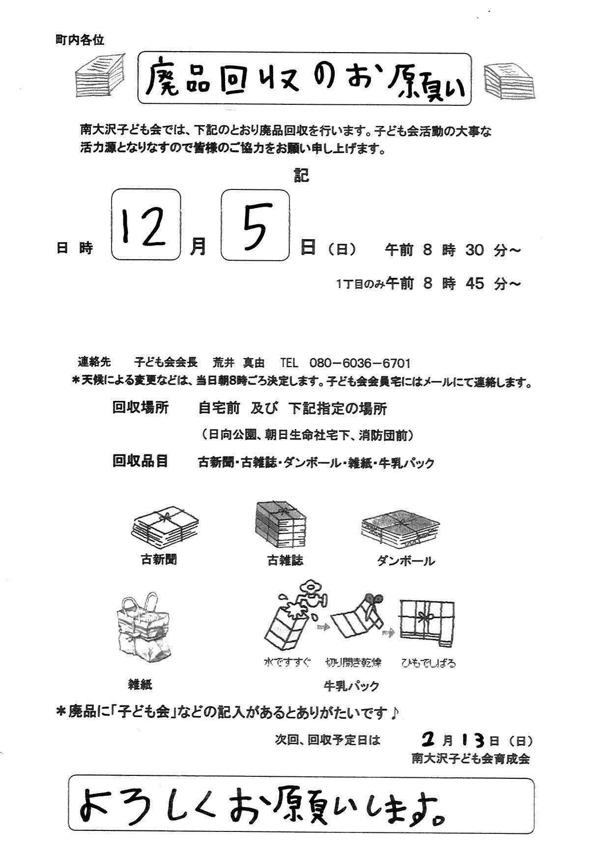 廃品回収のお願い 2021 11/14 お知らせ 2021年11月14日 お知らせ よかったらシェアしてね! URLをコピーしました! URLをコピーしました! 市長と語る めぐって 遊んで トクして 南大沢を楽しもう! 関連記事 4/18(土)19:00~ 定期総会開催のお知らせ(南大沢町会) 2026年4月12日 七頭舞を踊る会 会員募集のお知らせ(七頭舞を踊る会) 2026年4月12日 【注意喚起!!】侵入盗(空き巣)事件が発生しています(南大沢町会) 2026年4月5日 民生委員・児童委員が訪問調査を実施します(八王子市) 2026年4月5日 [報告]柚子の実会×おひさま広場コラボイベント『じいじばあばと昔あそび』を開催(南大沢町会) 2026年4月3日 3/28(土) 10:00~16:00 [観覧歓迎]銭湯絵師・中島盛夫さんと一緒に富士山を描こう!(joynみなみおおさわ、学生団体Bloomy)※実施レポート追記(4/3) 2026年3月27日 三井アウトレットパーク南大沢B街区建替え工事予定のお知らせ(三井不動産株式会社) 2026年3月26日 [町会員情報]令和8年度 会館利用スケジュールを掲載しました。(南大沢町会) 2026年3月26日