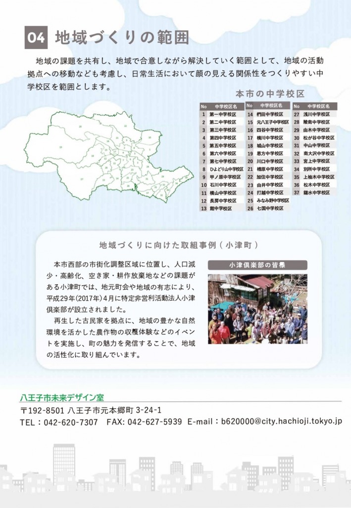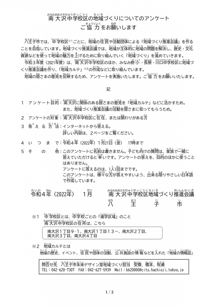 八王子市未来デザイン室より「南大沢中学校区の地域づくりについてのアンケート」の依頼がありました。南大沢の「地域カルテ」制作に役立てる目的で、回答期限は1月21日までとなっております。ご協力いただきますようお願い申し上げます。なお、本活動は、南大沢中学校区地域づくり推進会議が取り組んでおり、南大沢町会からも参加しております。