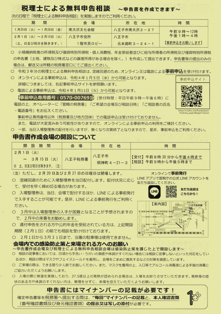 ご自宅からの確定申告にチャレンジしませんか?(八王子税務署からのお知らせ) 2022 1/16 お知らせ 2022年1月16日 PDF版を読む お知らせ よかったらシェアしてね! URLをコピーしました! URLをコピーしました! 南大沢中学校区の地域づくりについてのアンケートのお願い 令和4年度(2022年度)からのごみ・資源物の出し方について 関連記事 4/18(土)19:00~ 定期総会開催のお知らせ(南大沢町会) 2026年4月12日 七頭舞を踊る会 会員募集のお知らせ(七頭舞を踊る会) 2026年4月12日 【注意喚起!!】侵入盗(空き巣)事件が発生しています(南大沢町会) 2026年4月5日 民生委員・児童委員が訪問調査を実施します(八王子市) 2026年4月5日 [報告]柚子の実会×おひさま広場コラボイベント『じいじばあばと昔あそび』を開催(南大沢町会) 2026年4月3日 3/28(土) 10:00~16:00 [観覧歓迎]銭湯絵師・中島盛夫さんと一緒に富士山を描こう!(joynみなみおおさわ、学生団体Bloomy)※実施レポート追記(4/3) 2026年3月27日 三井アウトレットパーク南大沢B街区建替え工事予定のお知らせ(三井不動産株式会社) 2026年3月26日 [町会員情報]令和8年度 会館利用スケジュールを掲載しました。(南大沢町会) 2026年3月26日