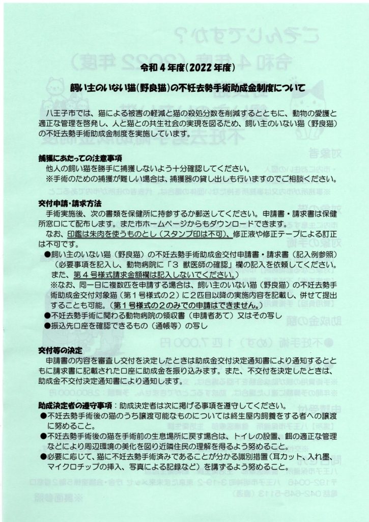 令和4(2022)年度 野良猫・飼い主のいない猫 不妊去勢手術助成金制度 2022 12/04 お知らせ 回覧 2022年12月4日 お知らせ 回覧 よかったらシェアしてね! URLをコピーしました! URLをコピーしました! 八王子市からのお知らせ(不用品持ち込みスポット・たべすけHACHIOJI) 八王子市保健所主催 動物講演会のお知らせ 関連記事 4/18(土)19:00~ 定期総会開催のお知らせ(南大沢町会) 2026年4月12日 七頭舞を踊る会 会員募集のお知らせ(七頭舞を踊る会) 2026年4月12日 【注意喚起!!】侵入盗(空き巣)事件が発生しています(南大沢町会) 2026年4月5日 民生委員・児童委員が訪問調査を実施します(八王子市) 2026年4月5日 [報告]柚子の実会×おひさま広場コラボイベント『じいじばあばと昔あそび』を開催(南大沢町会) 2026年4月3日 3/28(土) 10:00~16:00 [観覧歓迎]銭湯絵師・中島盛夫さんと一緒に富士山を描こう!(joynみなみおおさわ、学生団体Bloomy)※実施レポート追記(4/3) 2026年3月27日 三井アウトレットパーク南大沢B街区建替え工事予定のお知らせ(三井不動産株式会社) 2026年3月26日 [町会員情報]令和8年度 会館利用スケジュールを掲載しました。(南大沢町会) 2026年3月26日