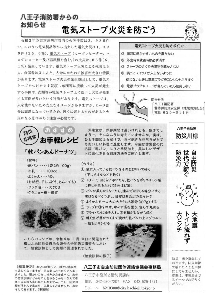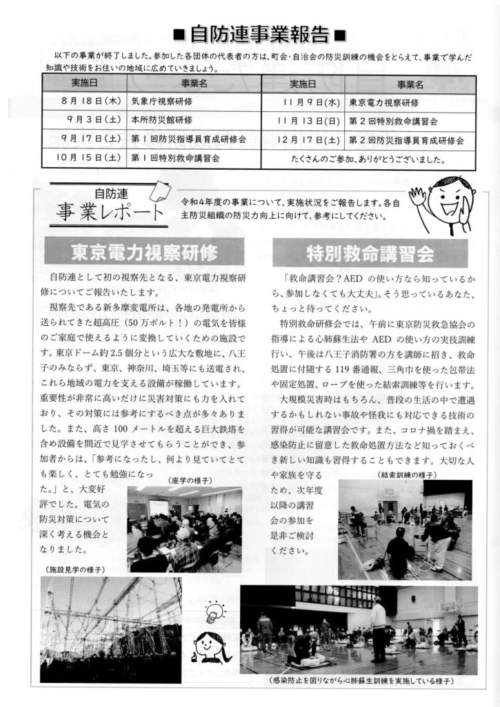 自防連だより 第52号(八王子市自主防災団体連絡協議会) 2023 1/22 お知らせ 回覧 2023年1月22日 お知らせ 回覧 よかったらシェアしてね! URLをコピーしました! URLをコピーしました! 八王子防火防災協会からのお知らせ(八王子防火防災協会) 八王子税務署からのお知らせ(八王子税務署) 関連記事 4/18(土)19:00~ 定期総会開催のお知らせ(南大沢町会) 2026年4月12日 七頭舞を踊る会 会員募集のお知らせ(七頭舞を踊る会) 2026年4月12日 【注意喚起!!】侵入盗(空き巣)事件が発生しています(南大沢町会) 2026年4月5日 民生委員・児童委員が訪問調査を実施します(八王子市) 2026年4月5日 [報告]柚子の実会×おひさま広場コラボイベント『じいじばあばと昔あそび』を開催(南大沢町会) 2026年4月3日 3/28(土) 10:00~16:00 [観覧歓迎]銭湯絵師・中島盛夫さんと一緒に富士山を描こう!(joynみなみおおさわ、学生団体Bloomy)※実施レポート追記(4/3) 2026年3月27日 三井アウトレットパーク南大沢B街区建替え工事予定のお知らせ(三井不動産株式会社) 2026年3月26日 [町会員情報]令和8年度 会館利用スケジュールを掲載しました。(南大沢町会) 2026年3月26日