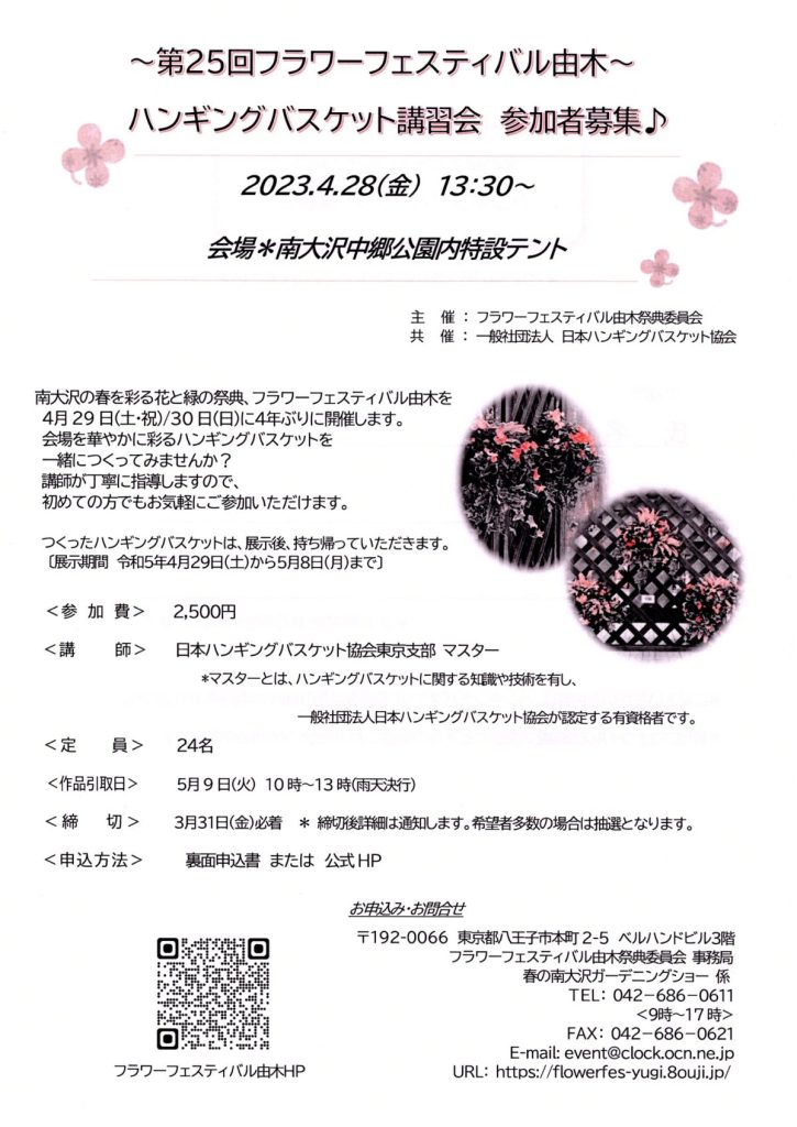 4/28 第25回フラワーフェスティバル由木 ハンギングバスケット講習会 参加者募集(3/31締切) 2023 3/04 お知らせ 回覧 2023年3月4日 フラワーフェスティバル由木のHPで申し込む お知らせ 回覧 よかったらシェアしてね! URLをコピーしました! URLをコピーしました! 3/1~7 春の火災予防運動~119だより 八王子市空家マッチング支援事業のご案内(八王子市住宅政策課) 関連記事 4/18(土)19:00~ 定期総会開催のお知らせ(南大沢町会) 2026年4月12日 七頭舞を踊る会 会員募集のお知らせ(七頭舞を踊る会) 2026年4月12日 【注意喚起!!】侵入盗(空き巣)事件が発生しています(南大沢町会) 2026年4月5日 民生委員・児童委員が訪問調査を実施します(八王子市) 2026年4月5日 [報告]柚子の実会×おひさま広場コラボイベント『じいじばあばと昔あそび』を開催(南大沢町会) 2026年4月3日 3/28(土) 10:00~16:00 [観覧歓迎]銭湯絵師・中島盛夫さんと一緒に富士山を描こう!(joynみなみおおさわ、学生団体Bloomy)※実施レポート追記(4/3) 2026年3月27日 三井アウトレットパーク南大沢B街区建替え工事予定のお知らせ(三井不動産株式会社) 2026年3月26日 [町会員情報]令和8年度 会館利用スケジュールを掲載しました。(南大沢町会) 2026年3月26日