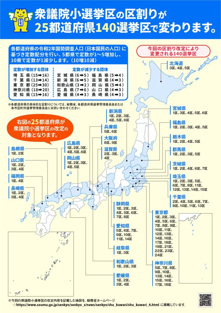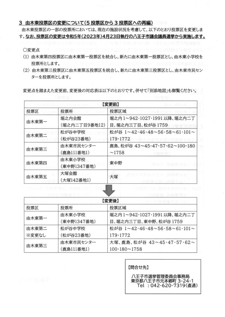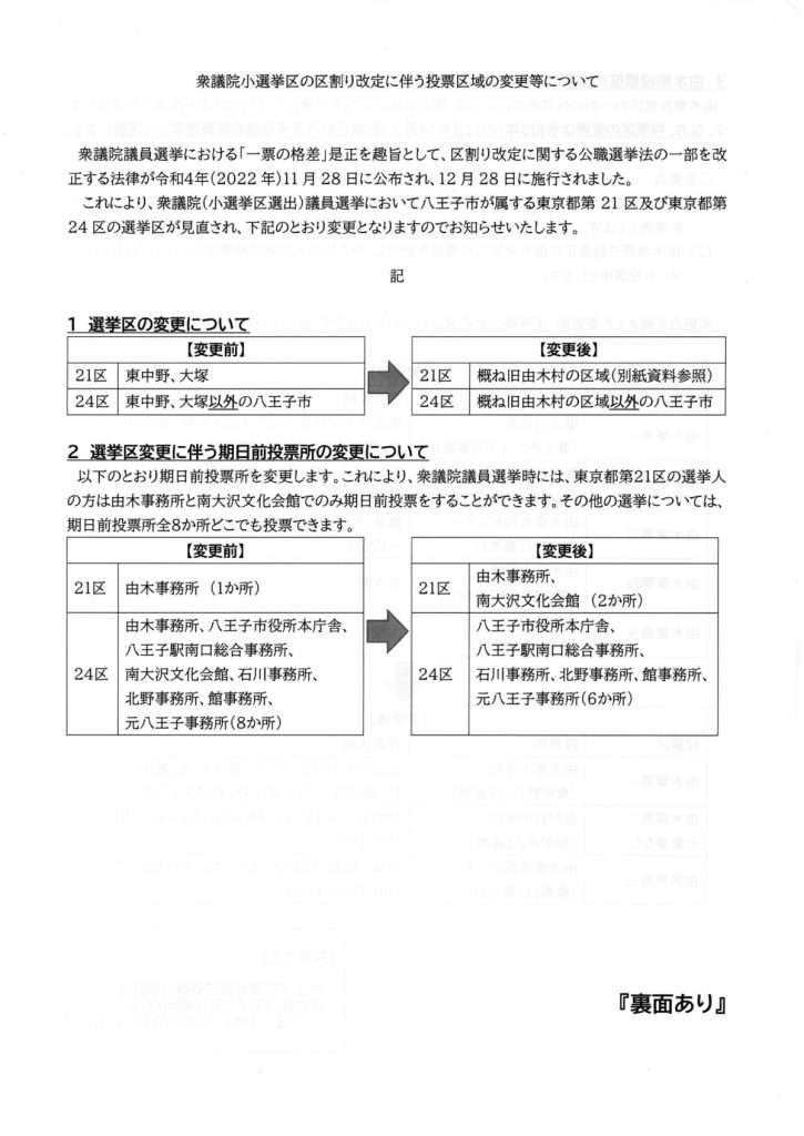 衆議院小選挙区の区割り改定に伴う投票区域の変更等について 2023 2/13 お知らせ 回覧 2023年2月13日 総務省のページを見る お知らせ 回覧 よかったらシェアしてね! URLをコピーしました! URLをコピーしました! 3/4(土) 9:15~クリーンデーのお知らせ 2~3月「清水入り緑地の里山的整備プロジェクト」のご案内 関連記事 4/18(土)19:00~ 定期総会開催のお知らせ(南大沢町会) 2026年4月12日 七頭舞を踊る会 会員募集のお知らせ(七頭舞を踊る会) 2026年4月12日 【注意喚起!!】侵入盗(空き巣)事件が発生しています(南大沢町会) 2026年4月5日 民生委員・児童委員が訪問調査を実施します(八王子市) 2026年4月5日 [報告]柚子の実会×おひさま広場コラボイベント『じいじばあばと昔あそび』を開催(南大沢町会) 2026年4月3日 3/28(土) 10:00~16:00 [観覧歓迎]銭湯絵師・中島盛夫さんと一緒に富士山を描こう!(joynみなみおおさわ、学生団体Bloomy)※実施レポート追記(4/3) 2026年3月27日 三井アウトレットパーク南大沢B街区建替え工事予定のお知らせ(三井不動産株式会社) 2026年3月26日 [町会員情報]令和8年度 会館利用スケジュールを掲載しました。(南大沢町会) 2026年3月26日