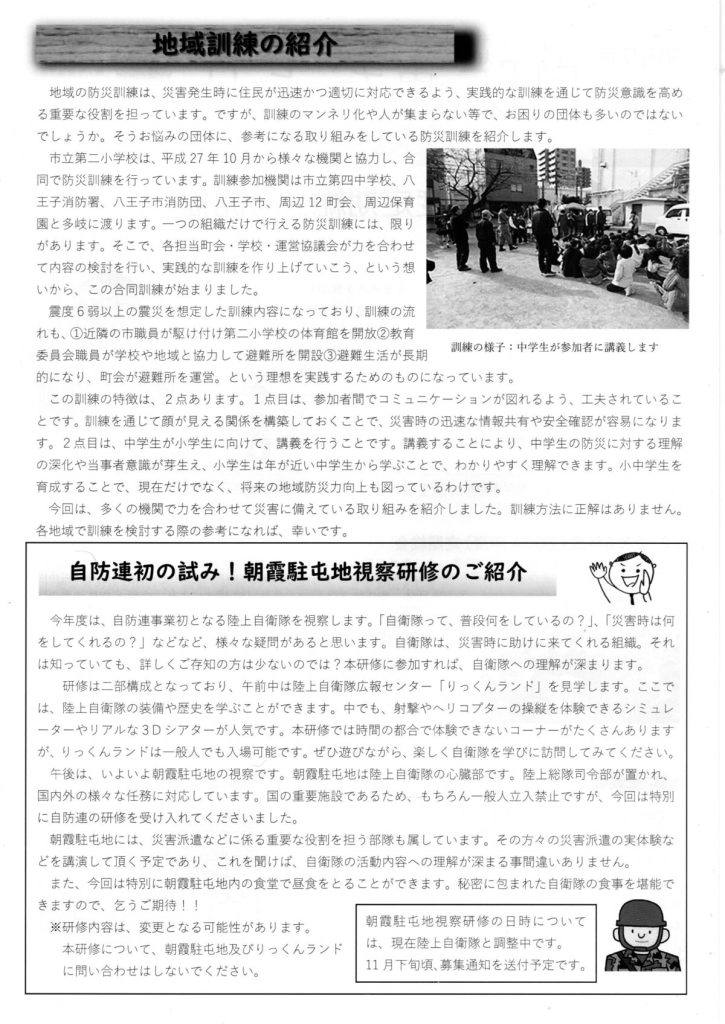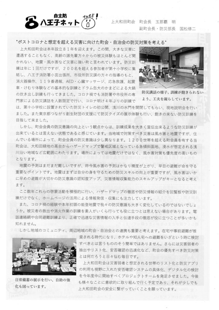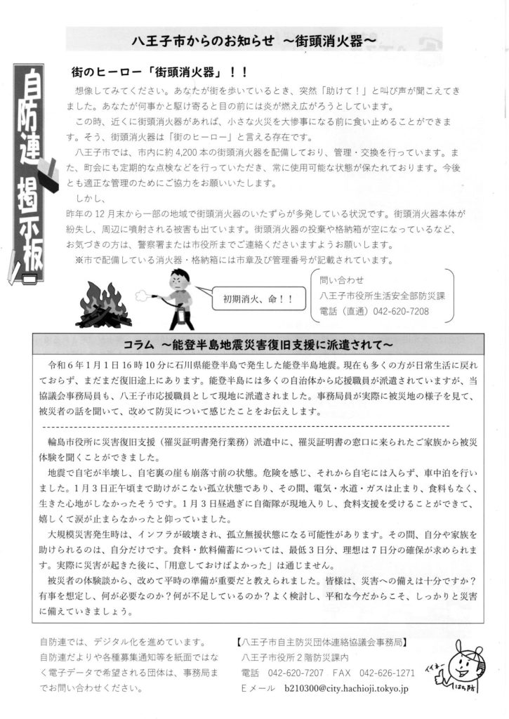 第57号 自防連だより(八王子市自主防災団体連絡協議会) 2024 8/05 お知らせ 回覧 2024年8月5日 お知らせ 回覧 よかったらシェアしてね! URLをコピーしました! URLをコピーしました! 8/30(金) はちまるサポーター募集(八王子市社会福祉協議会) あしかが 第54号(南大沢市民センター住民協議会) 関連記事 4/18(土)19:00~ 定期総会開催のお知らせ(南大沢町会) 2026年4月12日 七頭舞を踊る会 会員募集のお知らせ(七頭舞を踊る会) 2026年4月12日 【注意喚起!!】侵入盗(空き巣)事件が発生しています(南大沢町会) 2026年4月5日 民生委員・児童委員が訪問調査を実施します(八王子市) 2026年4月5日 [報告]柚子の実会×おひさま広場コラボイベント『じいじばあばと昔あそび』を開催(南大沢町会) 2026年4月3日 3/28(土) 10:00~16:00 [観覧歓迎]銭湯絵師・中島盛夫さんと一緒に富士山を描こう!(joynみなみおおさわ、学生団体Bloomy)※実施レポート追記(4/3) 2026年3月27日 三井アウトレットパーク南大沢B街区建替え工事予定のお知らせ(三井不動産株式会社) 2026年3月26日 [町会員情報]令和8年度 会館利用スケジュールを掲載しました。(南大沢町会) 2026年3月26日