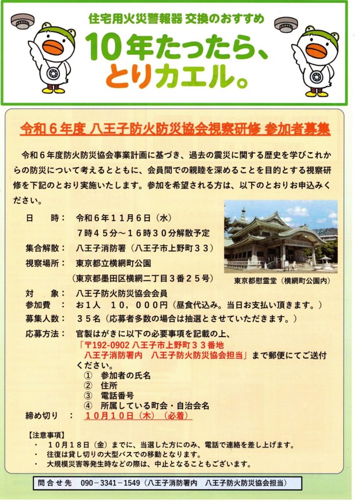 八王子防火防災協会からのお知らせ(八王子防火防災協会) 2024 9/15 お知らせ 回覧 2024年9月15日 お知らせ 回覧 よかったらシェアしてね! URLをコピーしました! URLをコピーしました! 高齢者あんしん相談センターからのお知らせ(八王子市福祉部) 無料耐震相談のご案内(八王子市まちなみ整備部) 関連記事 4/18(土)19:00~ 定期総会開催のお知らせ(南大沢町会) 2026年4月12日 七頭舞を踊る会 会員募集のお知らせ(七頭舞を踊る会) 2026年4月12日 【注意喚起!!】侵入盗(空き巣)事件が発生しています(南大沢町会) 2026年4月5日 民生委員・児童委員が訪問調査を実施します(八王子市) 2026年4月5日 [報告]柚子の実会×おひさま広場コラボイベント『じいじばあばと昔あそび』を開催(南大沢町会) 2026年4月3日 3/28(土) 10:00~16:00 [観覧歓迎]銭湯絵師・中島盛夫さんと一緒に富士山を描こう!(joynみなみおおさわ、学生団体Bloomy)※実施レポート追記(4/3) 2026年3月27日 三井アウトレットパーク南大沢B街区建替え工事予定のお知らせ(三井不動産株式会社) 2026年3月26日 [町会員情報]令和8年度 会館利用スケジュールを掲載しました。(南大沢町会) 2026年3月26日