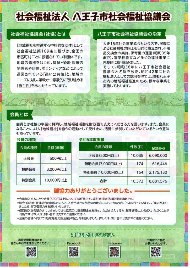 八王子市社会福祉協議会からのお知らせ(八王子市社会福祉協議会) 2024 9/15 お知らせ 回覧 2024年9月15日 お知らせ 回覧 よかったらシェアしてね! URLをコピーしました! URLをコピーしました! 無料耐震相談のご案内(八王子市まちなみ整備部) 9/28(土),29(日) 第27回 南大沢市民センターまつり(住民協議会) 関連記事 4/18(土)19:00~ 定期総会開催のお知らせ(南大沢町会) 2026年4月12日 七頭舞を踊る会 会員募集のお知らせ(七頭舞を踊る会) 2026年4月12日 【注意喚起!!】侵入盗(空き巣)事件が発生しています(南大沢町会) 2026年4月5日 民生委員・児童委員が訪問調査を実施します(八王子市) 2026年4月5日 [報告]柚子の実会×おひさま広場コラボイベント『じいじばあばと昔あそび』を開催(南大沢町会) 2026年4月3日 3/28(土) 10:00~16:00 [観覧歓迎]銭湯絵師・中島盛夫さんと一緒に富士山を描こう!(joynみなみおおさわ、学生団体Bloomy)※実施レポート追記(4/3) 2026年3月27日 三井アウトレットパーク南大沢B街区建替え工事予定のお知らせ(三井不動産株式会社) 2026年3月26日 [町会員情報]令和8年度 会館利用スケジュールを掲載しました。(南大沢町会) 2026年3月26日