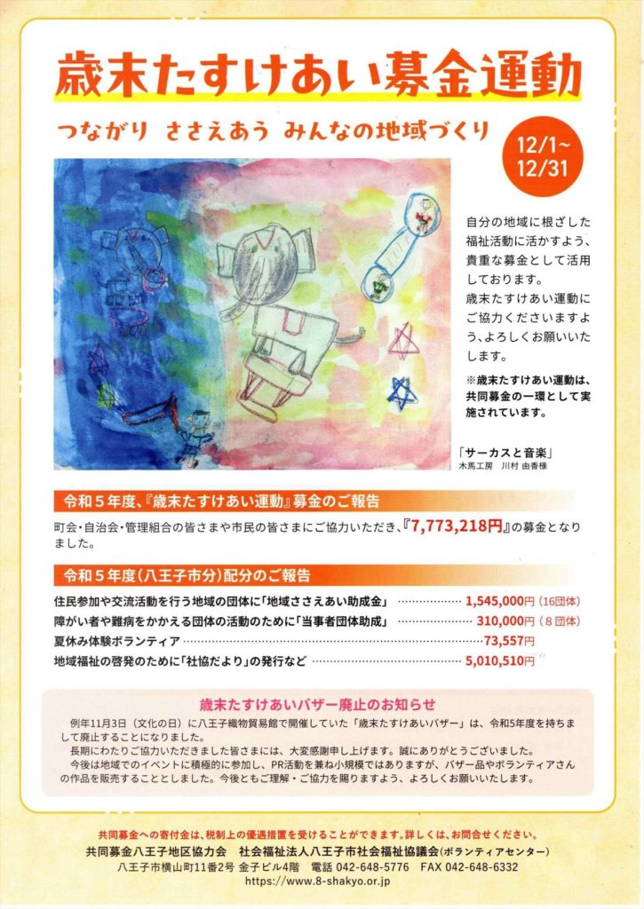 赤い羽根共同募金運動・歳末たすけあい募金運動のご案内(八王子市社会福祉協議会) 2024 10/12 お知らせ 回覧 2024年10月12日 お知らせ 回覧 よかったらシェアしてね! URLをコピーしました! URLをコピーしました! 10/19(土) 南大沢小学校ブロック・地域防災訓練(南大沢地域自主防災協議会) シルバー いきいき新聞【2024年度・保存版】(八王子市高齢者あんしん相談センター南大沢) 関連記事 4/18(土)19:00~ 定期総会開催のお知らせ(南大沢町会) 2026年4月12日 七頭舞を踊る会 会員募集のお知らせ(七頭舞を踊る会) 2026年4月12日 【注意喚起!!】侵入盗(空き巣)事件が発生しています(南大沢町会) 2026年4月5日 民生委員・児童委員が訪問調査を実施します(八王子市) 2026年4月5日 [報告]柚子の実会×おひさま広場コラボイベント『じいじばあばと昔あそび』を開催(南大沢町会) 2026年4月3日 3/28(土) 10:00~16:00 [観覧歓迎]銭湯絵師・中島盛夫さんと一緒に富士山を描こう!(joynみなみおおさわ、学生団体Bloomy)※実施レポート追記(4/3) 2026年3月27日 三井アウトレットパーク南大沢B街区建替え工事予定のお知らせ(三井不動産株式会社) 2026年3月26日 [町会員情報]令和8年度 会館利用スケジュールを掲載しました。(南大沢町会) 2026年3月26日