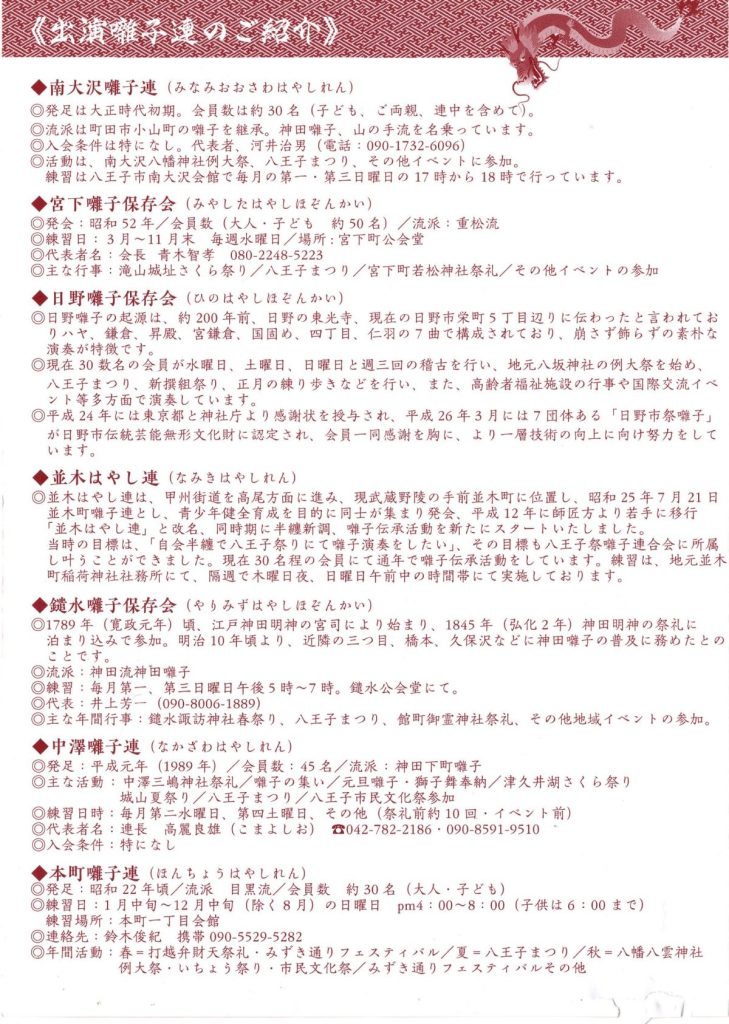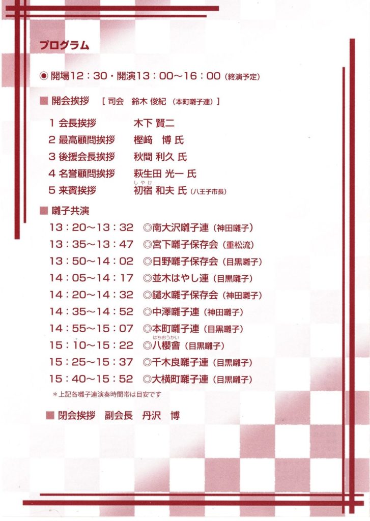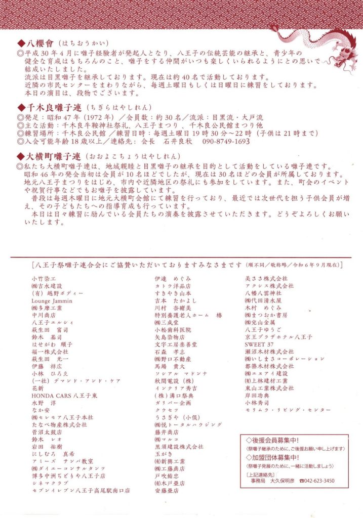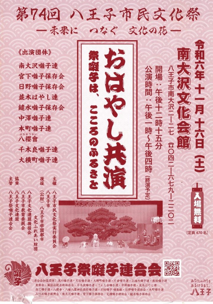 第74回 八王子市民文化祭~おはやし共催~(八王子祭囃子連合会) 2024 11/11 お知らせ 回覧 2024年11月11日 お知らせ 回覧 よかったらシェアしてね! URLをコピーしました! URLをコピーしました! 11/11 いきいきフェスタ(高齢者あんしん相談センター南大沢) 歩道整備工事のお知らせ(南大沢二丁目~松木中下交差点)(東京都) 関連記事 4/18(土)19:00~ 定期総会開催のお知らせ(南大沢町会) 2026年4月12日 七頭舞を踊る会 会員募集のお知らせ(七頭舞を踊る会) 2026年4月12日 【注意喚起!!】侵入盗(空き巣)事件が発生しています(南大沢町会) 2026年4月5日 民生委員・児童委員が訪問調査を実施します(八王子市) 2026年4月5日 [報告]柚子の実会×おひさま広場コラボイベント『じいじばあばと昔あそび』を開催(南大沢町会) 2026年4月3日 3/28(土) 10:00~16:00 [観覧歓迎]銭湯絵師・中島盛夫さんと一緒に富士山を描こう!(joynみなみおおさわ、学生団体Bloomy)※実施レポート追記(4/3) 2026年3月27日 三井アウトレットパーク南大沢B街区建替え工事予定のお知らせ(三井不動産株式会社) 2026年3月26日 [町会員情報]令和8年度 会館利用スケジュールを掲載しました。(南大沢町会) 2026年3月26日