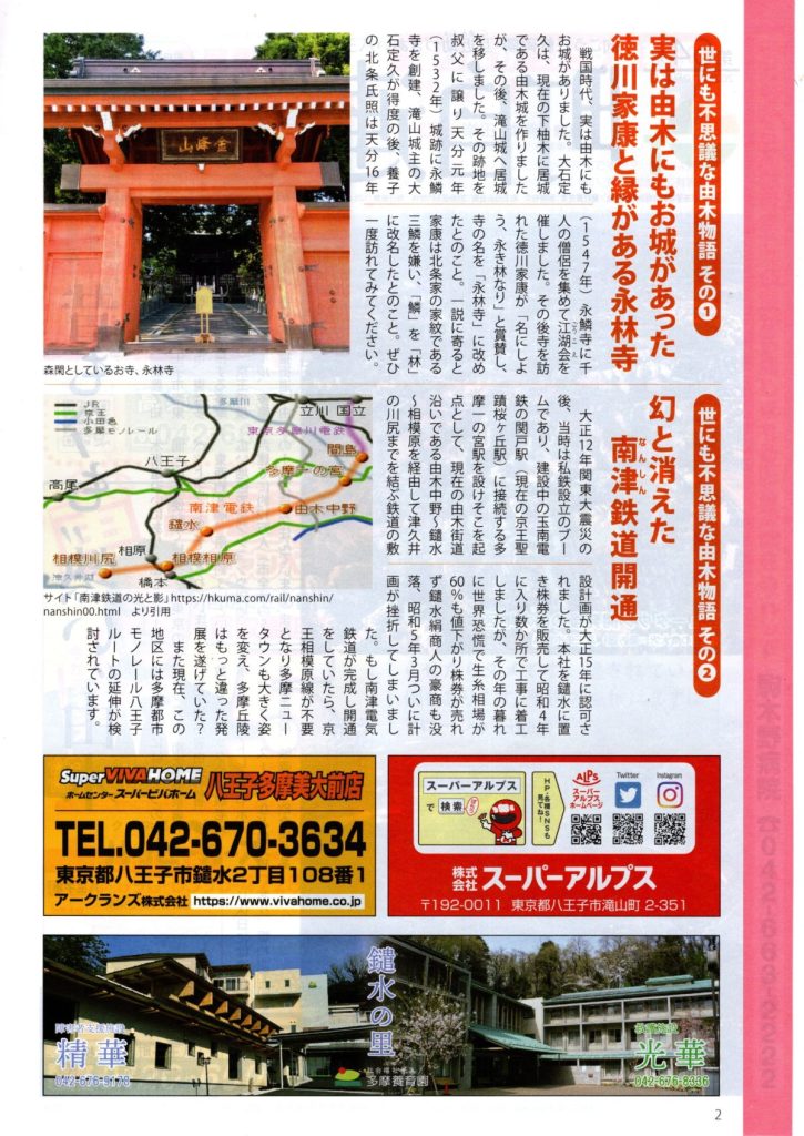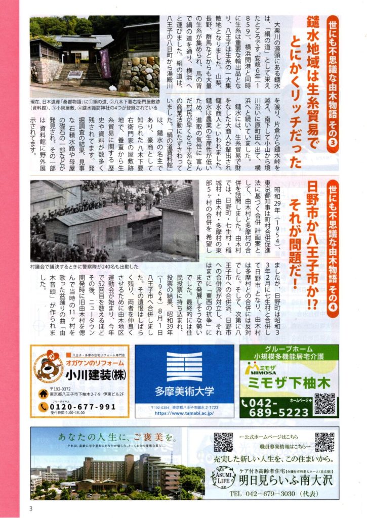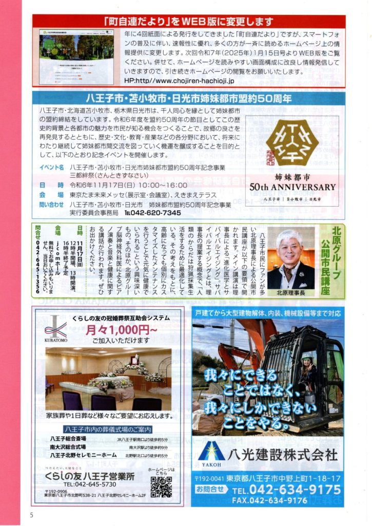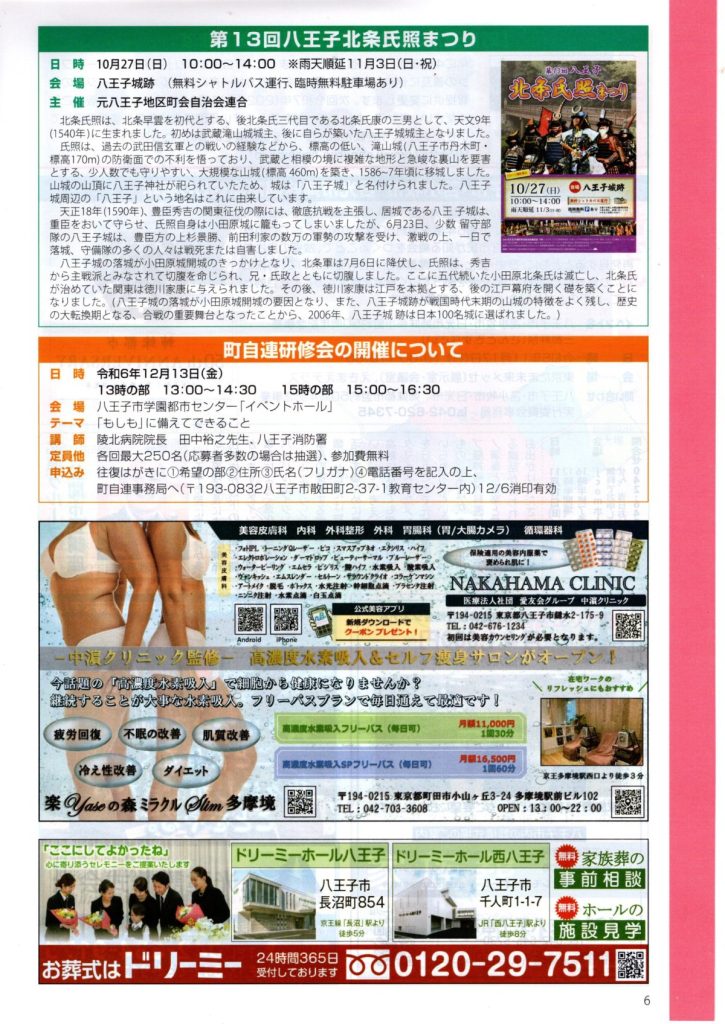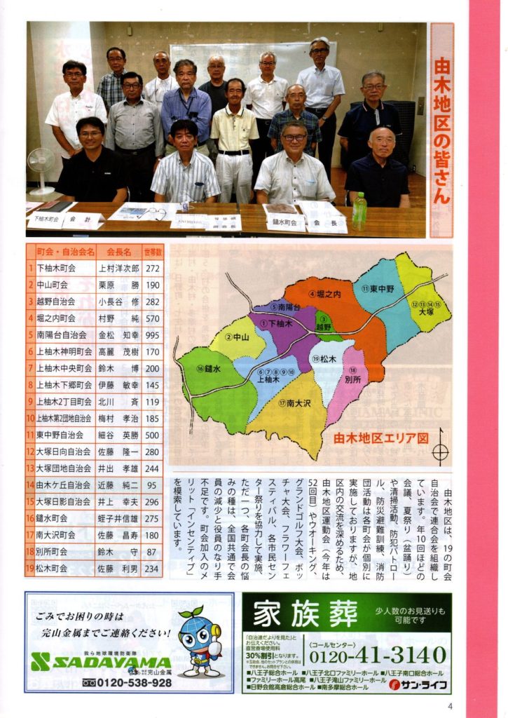 町自連だより 第64号(八王子市町会自治会連合会) 2024 11/11 お知らせ 回覧 2024年11月11日 お知らせ 回覧 よかったらシェアしてね! URLをコピーしました! URLをコピーしました! 道路舗装工事のお知らせ(市道由木800号線外2路線)(八王子市) 12/21 クリーンデー開催のお知らせ(八王子市青少年対策南大沢地区委員会) 関連記事 4/18(土)19:00~ 定期総会開催のお知らせ(南大沢町会) 2026年4月12日 七頭舞を踊る会 会員募集のお知らせ(七頭舞を踊る会) 2026年4月12日 【注意喚起!!】侵入盗(空き巣)事件が発生しています(南大沢町会) 2026年4月5日 民生委員・児童委員が訪問調査を実施します(八王子市) 2026年4月5日 [報告]柚子の実会×おひさま広場コラボイベント『じいじばあばと昔あそび』を開催(南大沢町会) 2026年4月3日 3/28(土) 10:00~16:00 [観覧歓迎]銭湯絵師・中島盛夫さんと一緒に富士山を描こう!(joynみなみおおさわ、学生団体Bloomy)※実施レポート追記(4/3) 2026年3月27日 三井アウトレットパーク南大沢B街区建替え工事予定のお知らせ(三井不動産株式会社) 2026年3月26日 [町会員情報]令和8年度 会館利用スケジュールを掲載しました。(南大沢町会) 2026年3月26日