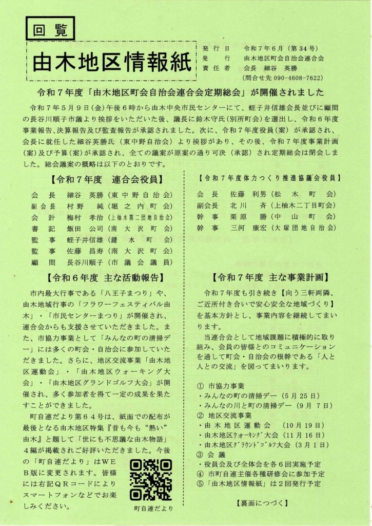 由木地区情報紙(由木地区町会自治会連合会) 2025 7/07 回覧 2025年7月7日 回覧 よかったらシェアしてね! URLをコピーしました! URLをコピーしました! 八王子防火防災協会からのお知らせ(八王子防火防災協会) 7/21(月・祝) むかしの南大沢を語る会、盆踊り練習会(南大沢町会) 関連記事 【3/28追加開催】3/26,28 不登校の子供たちのための体験型学校「高尾山学園」分校設置説明会開催案内(八王子市教育委員会) 2026年3月10日 3/28~4/5 富士見台公園 桜まつり(西由木コミュニティバーク) 2026年3月10日 第28回フラワーフェスティバル由木 ハンギングバスケット講習会 参加者募集(フラワーフェスティバル由木祭典委員会) 2026年3月10日 第61号 自防連だより(八王子市自主防災団体連絡協議会) 2026年3月10日 第35号 由木地区情報紙(由木地区町会自治会連合会) 2026年1月6日 12/20(土) クリーンデー(八王子市青少年対策南大沢地区委員会) 2025年11月29日 シルバーいきいき新聞 2025年度 保存版(八王子市高齢者あんしん相談センター南大沢) 2025年11月3日 11/24(月・祝) いきいきフェスタ(八王子市地域包括支援センター南大沢) 2025年11月3日