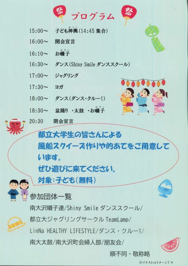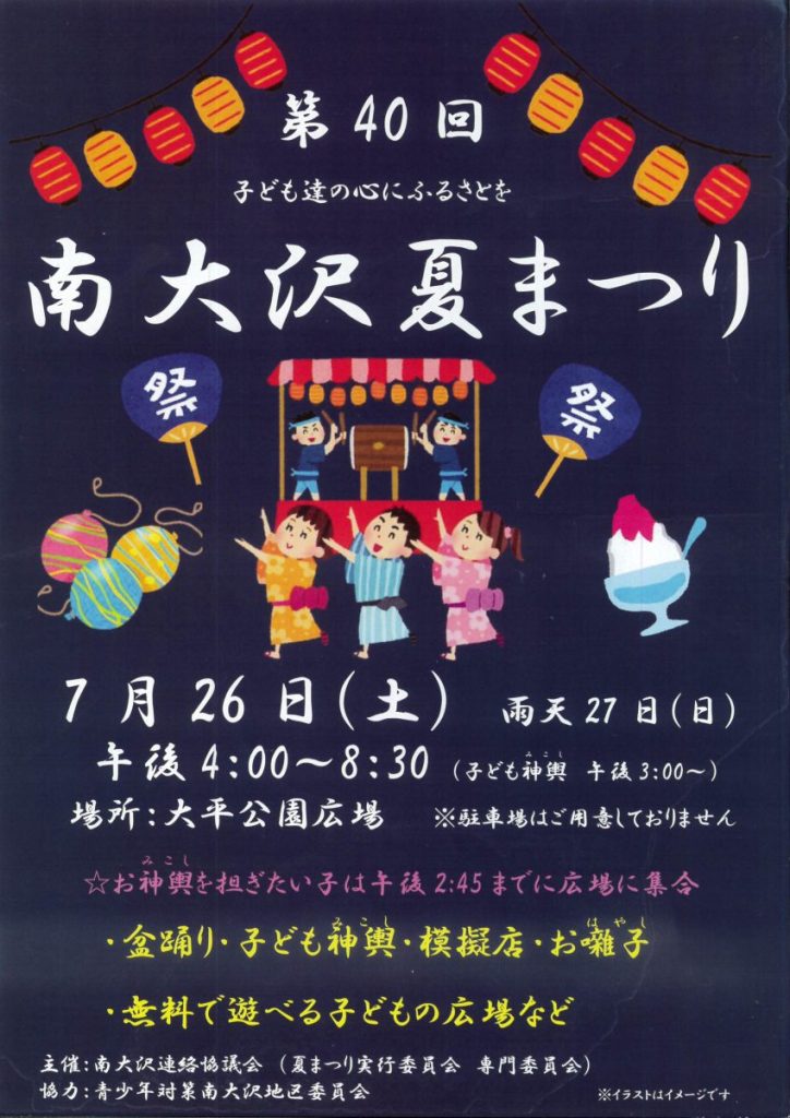 7/26(土) 第40回 南大沢夏まつり@大平公園(南大沢連絡協議会) 2025 7/12 お知らせ 2025年7月12日 お知らせ よかったらシェアしてね! URLをコピーしました! URLをコピーしました! 【終了】7/13 自転車ロードレース開催に伴う交通規制のお知らせ(警視庁) 令和7年度八王子市定住促進奨学金返還支援事業のご案内(八王子市) 関連記事 4/18(土)19:00~ 定期総会開催のお知らせ(南大沢町会) 2026年4月12日 七頭舞を踊る会 会員募集のお知らせ(七頭舞を踊る会) 2026年4月12日 【注意喚起!!】侵入盗(空き巣)事件が発生しています(南大沢町会) 2026年4月5日 民生委員・児童委員が訪問調査を実施します(八王子市) 2026年4月5日 [報告]柚子の実会×おひさま広場コラボイベント『じいじばあばと昔あそび』を開催(南大沢町会) 2026年4月3日 3/28(土) 10:00~16:00 [観覧歓迎]銭湯絵師・中島盛夫さんと一緒に富士山を描こう!(joynみなみおおさわ、学生団体Bloomy)※実施レポート追記(4/3) 2026年3月27日 三井アウトレットパーク南大沢B街区建替え工事予定のお知らせ(三井不動産株式会社) 2026年3月26日 [町会員情報]令和8年度 会館利用スケジュールを掲載しました。(南大沢町会) 2026年3月26日