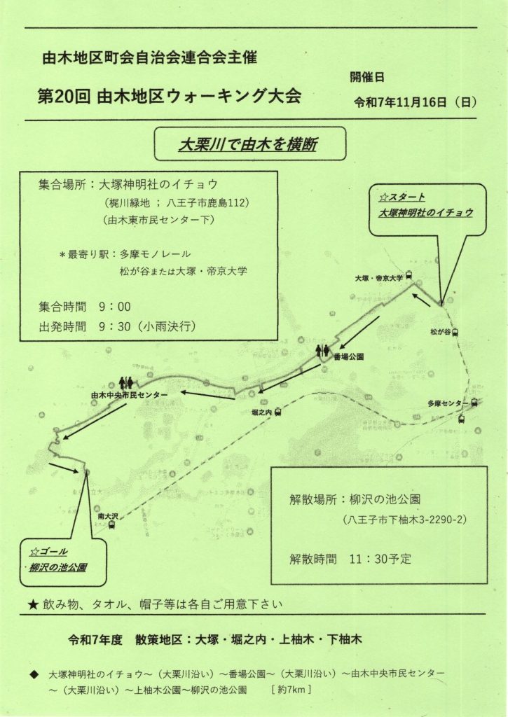 11/16 第20回 由木地区ウォーキング大会のお知らせ(由木地区町会自治会連合会) 2025 10/05 お知らせ 回覧 2025年10月5日 お知らせ 回覧 よかったらシェアしてね! URLをコピーしました! URLをコピーしました! 10/1~12/31 赤い羽根共同募金運動のお知らせ(八王子市社会福祉協議会) 10/11~13 みなみおおさワンwithにゃん開催のお知らせ(三井アウトレットパーク多摩南大沢) 関連記事 4/18(土)19:00~ 定期総会開催のお知らせ(南大沢町会) 2026年4月12日 七頭舞を踊る会 会員募集のお知らせ(七頭舞を踊る会) 2026年4月12日 【注意喚起!!】侵入盗(空き巣)事件が発生しています(南大沢町会) 2026年4月5日 民生委員・児童委員が訪問調査を実施します(八王子市) 2026年4月5日 [報告]柚子の実会×おひさま広場コラボイベント『じいじばあばと昔あそび』を開催(南大沢町会) 2026年4月3日 3/28(土) 10:00~16:00 [観覧歓迎]銭湯絵師・中島盛夫さんと一緒に富士山を描こう!(joynみなみおおさわ、学生団体Bloomy)※実施レポート追記(4/3) 2026年3月27日 三井アウトレットパーク南大沢B街区建替え工事予定のお知らせ(三井不動産株式会社) 2026年3月26日 [町会員情報]令和8年度 会館利用スケジュールを掲載しました。(南大沢町会) 2026年3月26日