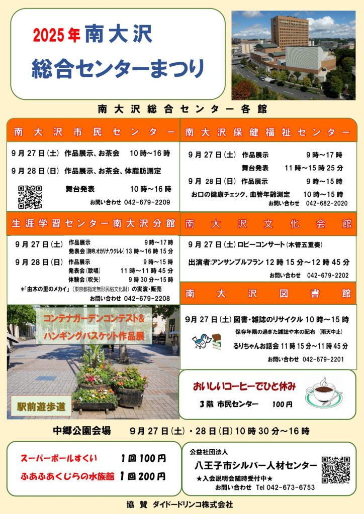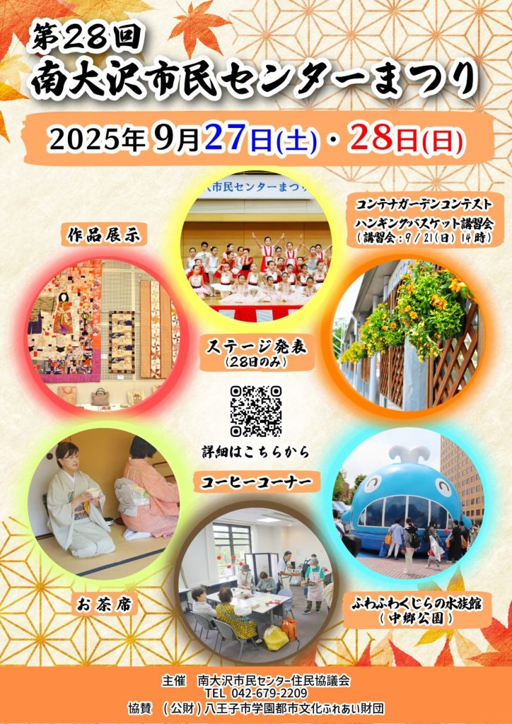 9/27,28 第28回 南大沢市民センターまつり&秋のガーデニングショー 2025 9/22 お知らせ 2025年9月22日 詳細をチェック(外部サイト) お知らせ よかったらシェアしてね! URLをコピーしました! URLをコピーしました! 令和7年 南大沢八幡神社 例大祭・夏まつりのご報告 みまもりあいプロジェクトのご案内(社団法人セーフティネットリンケージ) 関連記事 4/18(土)19:00~ 定期総会開催のお知らせ(南大沢町会) 2026年4月12日 七頭舞を踊る会 会員募集のお知らせ(七頭舞を踊る会) 2026年4月12日 【注意喚起!!】侵入盗(空き巣)事件が発生しています(南大沢町会) 2026年4月5日 民生委員・児童委員が訪問調査を実施します(八王子市) 2026年4月5日 [報告]柚子の実会×おひさま広場コラボイベント『じいじばあばと昔あそび』を開催(南大沢町会) 2026年4月3日 3/28(土) 10:00~16:00 [観覧歓迎]銭湯絵師・中島盛夫さんと一緒に富士山を描こう!(joynみなみおおさわ、学生団体Bloomy)※実施レポート追記(4/3) 2026年3月27日 三井アウトレットパーク南大沢B街区建替え工事予定のお知らせ(三井不動産株式会社) 2026年3月26日 [町会員情報]令和8年度 会館利用スケジュールを掲載しました。(南大沢町会) 2026年3月26日