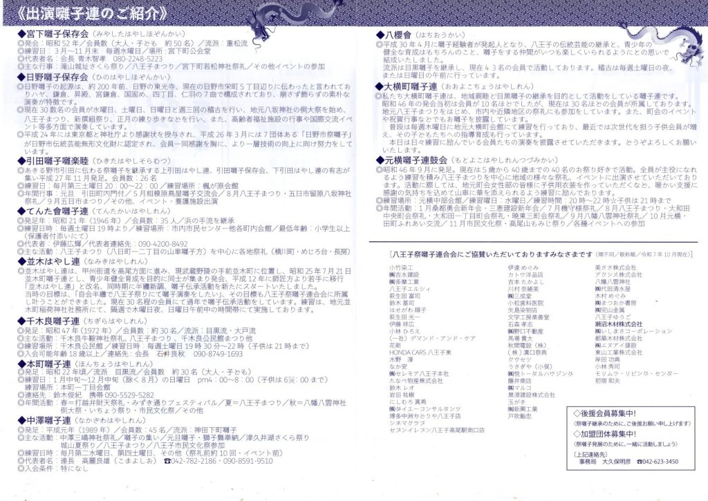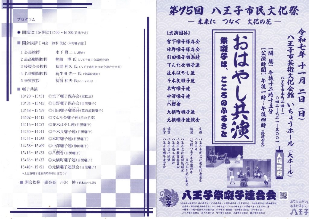 11/2(日) 第75回 八王子市民文化祭~おはやし共演(八王子祭囃子連合会) 2025 11/03 お知らせ 回覧 2025年10月23日2025年11月3日 お知らせ 回覧 よかったらシェアしてね! URLをコピーしました! URLをコピーしました! [募集]町会や地域との関わり方についてのインタビュー(南大沢町会) 11/24(月・祝) いきいきフェスタ(八王子市地域包括支援センター南大沢) 関連記事 4/18(土)19:00~ 定期総会開催のお知らせ(南大沢町会) 2026年4月12日 七頭舞を踊る会 会員募集のお知らせ(七頭舞を踊る会) 2026年4月12日 【注意喚起!!】侵入盗(空き巣)事件が発生しています(南大沢町会) 2026年4月5日 民生委員・児童委員が訪問調査を実施します(八王子市) 2026年4月5日 [報告]柚子の実会×おひさま広場コラボイベント『じいじばあばと昔あそび』を開催(南大沢町会) 2026年4月3日 3/28(土) 10:00~16:00 [観覧歓迎]銭湯絵師・中島盛夫さんと一緒に富士山を描こう!(joynみなみおおさわ、学生団体Bloomy)※実施レポート追記(4/3) 2026年3月27日 三井アウトレットパーク南大沢B街区建替え工事予定のお知らせ(三井不動産株式会社) 2026年3月26日 [町会員情報]令和8年度 会館利用スケジュールを掲載しました。(南大沢町会) 2026年3月26日