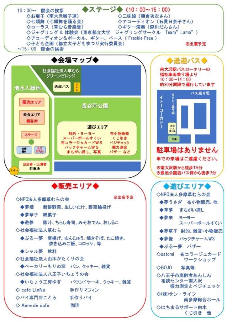 「南大沢囃子連」によるお囃子、「七頭舞を踊る会」による七頭舞などのステージ他、販売・遊びコーナーと楽しいおまつりとなっています。みなさまのご来場をお待ちしております。
