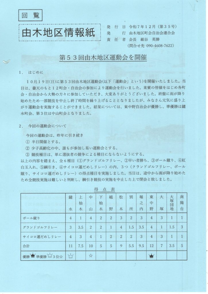 第35号 由木地区情報紙(由木地区町会自治会連合会) 2026 1/06 お知らせ 回覧 2026年1月6日 お知らせ 回覧 よかったらシェアしてね! URLをコピーしました! URLをコピーしました! 令和7年度 賛助会員のご紹介(南大沢町会) 八王子税務署からのお知らせ(八王子税務署) 関連記事 4/18(土)19:00~ 定期総会開催のお知らせ(南大沢町会) 2026年4月12日 七頭舞を踊る会 会員募集のお知らせ(七頭舞を踊る会) 2026年4月12日 【注意喚起!!】侵入盗(空き巣)事件が発生しています(南大沢町会) 2026年4月5日 民生委員・児童委員が訪問調査を実施します(八王子市) 2026年4月5日 [報告]柚子の実会×おひさま広場コラボイベント『じいじばあばと昔あそび』を開催(南大沢町会) 2026年4月3日 3/28(土) 10:00~16:00 [観覧歓迎]銭湯絵師・中島盛夫さんと一緒に富士山を描こう!(joynみなみおおさわ、学生団体Bloomy)※実施レポート追記(4/3) 2026年3月27日 三井アウトレットパーク南大沢B街区建替え工事予定のお知らせ(三井不動産株式会社) 2026年3月26日 [町会員情報]令和8年度 会館利用スケジュールを掲載しました。(南大沢町会) 2026年3月26日