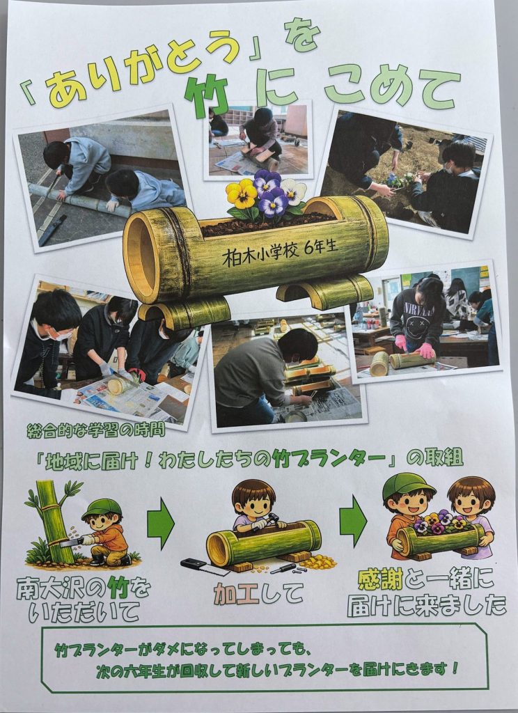 柏木小学校6年生「総合的な学習の時間」で実施された「地域に届け!わたしたちの竹プランター」の取り組みをご紹介します。