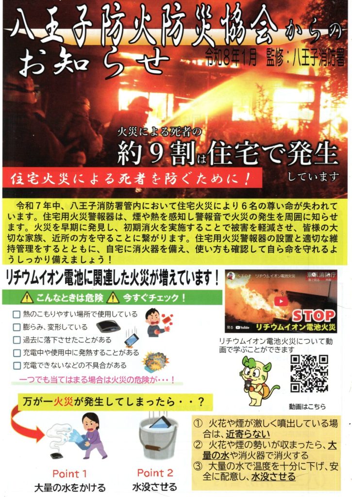 八王子防火防災協会からのお知らせ(八王子防火防災協会) 2026 2/12 お知らせ 2026年2月12日 お知らせ よかったらシェアしてね! URLをコピーしました! URLをコピーしました! 柏木小学校6年「地域に届け!わたしたちの竹プランター」取組紹介(南大沢町会) 3/1~7 春の火災予防運動(八王子消防署) 関連記事 4/18(土)19:00~ 定期総会開催のお知らせ(南大沢町会) 2026年4月12日 七頭舞を踊る会 会員募集のお知らせ(七頭舞を踊る会) 2026年4月12日 【注意喚起!!】侵入盗(空き巣)事件が発生しています(南大沢町会) 2026年4月5日 民生委員・児童委員が訪問調査を実施します(八王子市) 2026年4月5日 [報告]柚子の実会×おひさま広場コラボイベント『じいじばあばと昔あそび』を開催(南大沢町会) 2026年4月3日 3/28(土) 10:00~16:00 [観覧歓迎]銭湯絵師・中島盛夫さんと一緒に富士山を描こう!(joynみなみおおさわ、学生団体Bloomy)※実施レポート追記(4/3) 2026年3月27日 三井アウトレットパーク南大沢B街区建替え工事予定のお知らせ(三井不動産株式会社) 2026年3月26日 [町会員情報]令和8年度 会館利用スケジュールを掲載しました。(南大沢町会) 2026年3月26日