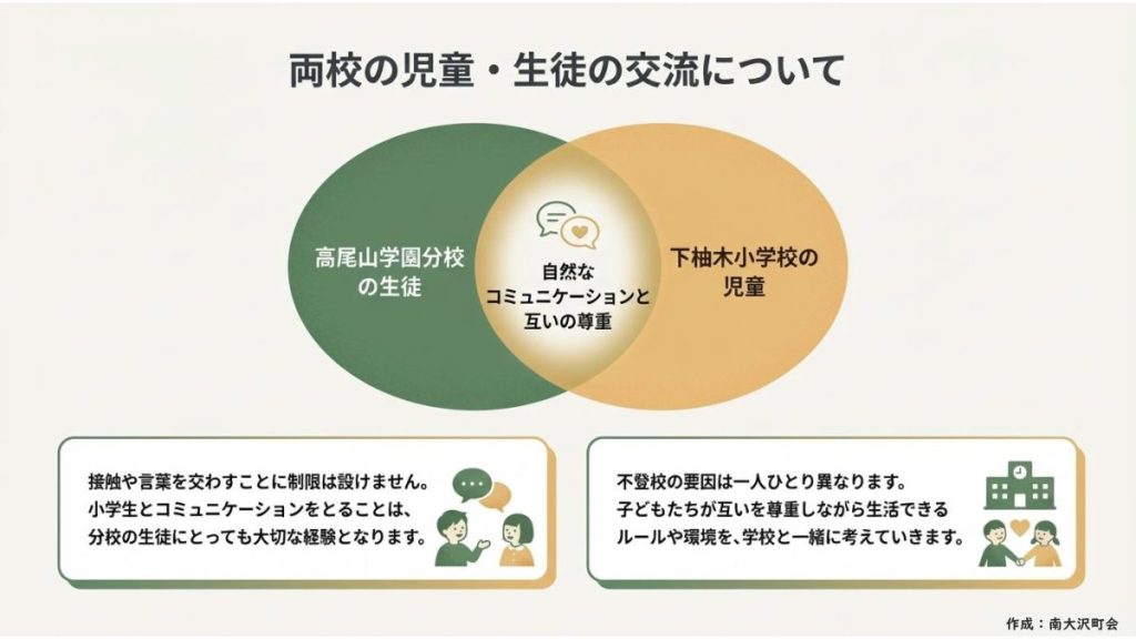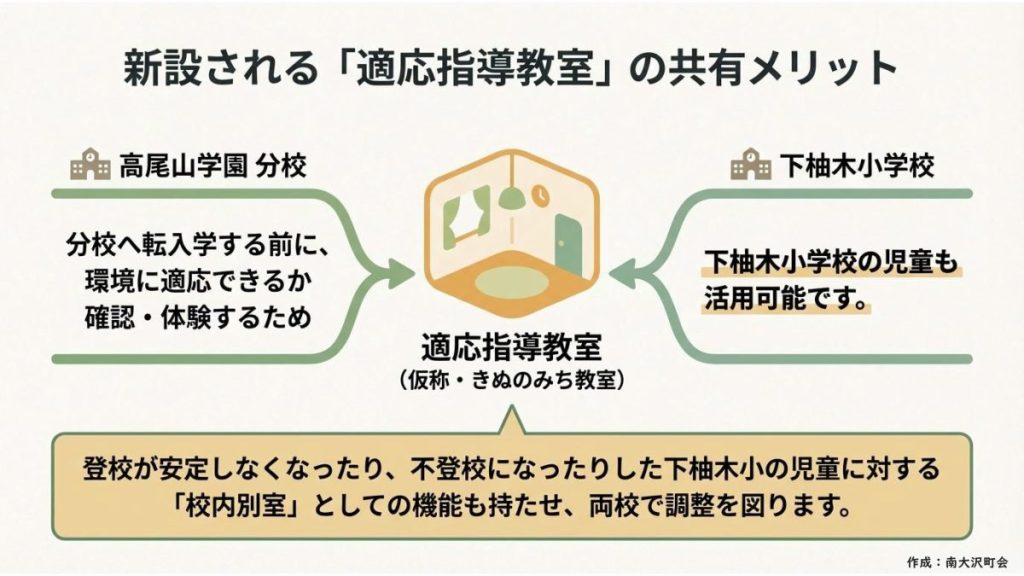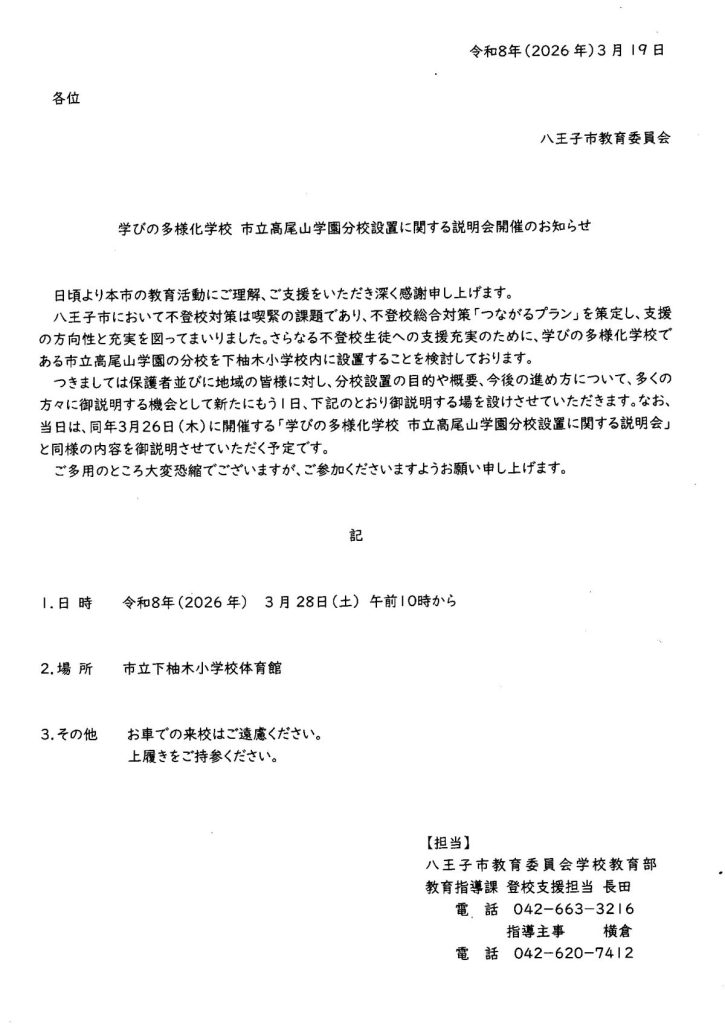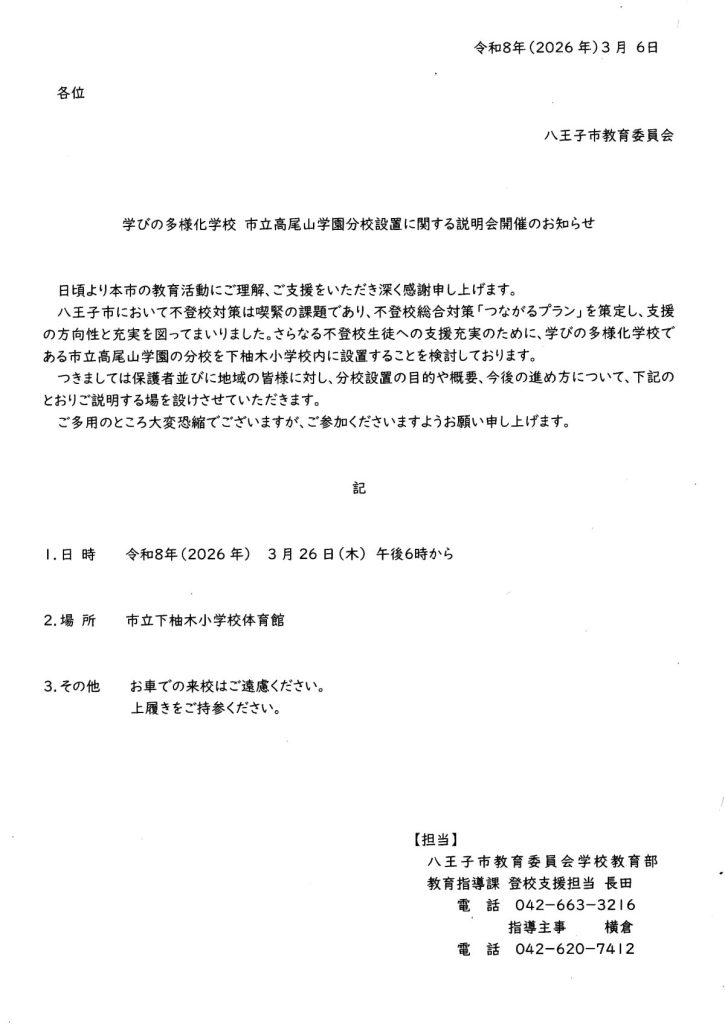 不登校に悩む由木地域の生徒さんが、これまでより通いやすい新たな学びの環境として「高尾山学園分校」を下柚木小学校の校舎内に開校することが検討されており、この取組みに関する説明会が開催されます。
