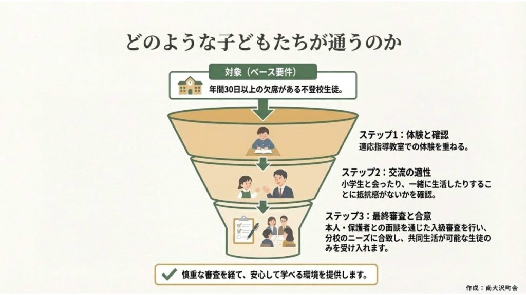 ・対象は八王子在住の小4~中学生で、病気・経済的理由以外で年間30日以上欠席した「通いたい」意欲のある子