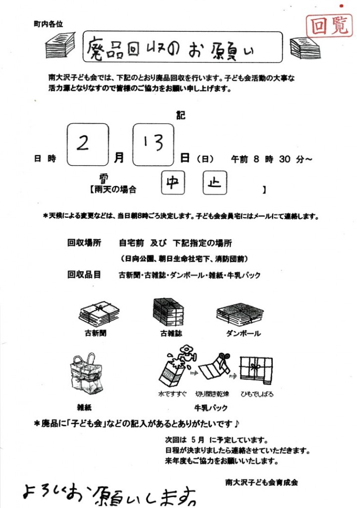 廃品回収のお願い(南大沢子ども会育成会)