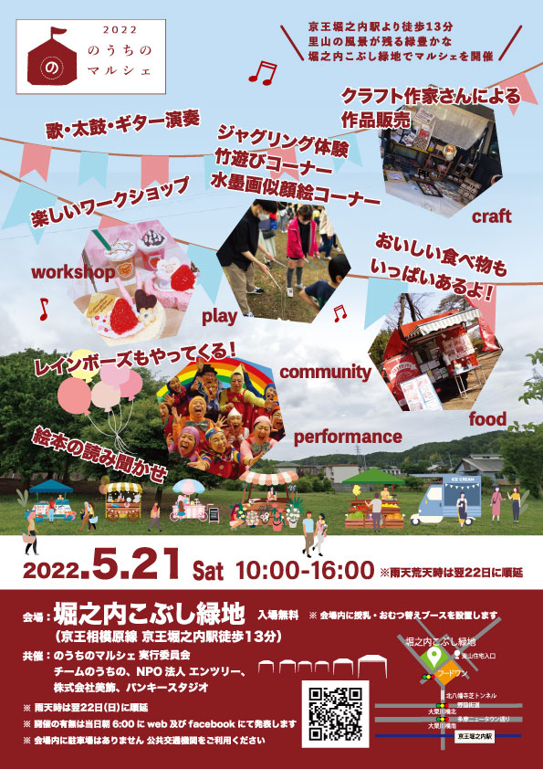 〇イベント名:「のうちのマルシェ」〇開催日程:5月21日(土)10時から16時まで〇会場:堀之内こぶし緑地(堀之内6-571-2)〇内容:30以上の団体によるクラフト、飲食、体験、パフォーマンスと、 一日中楽しめる内容となっております。レインボウズさんの... -