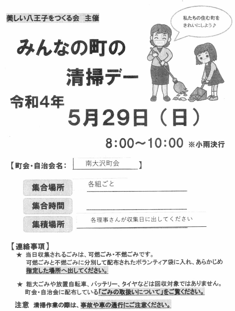 令和4年5月29日(日)8:00~10:00 ※雨天決行 実施方法(集合時間・場所や集積場所)は、各組毎に異なります。詳しくは各組の理事にお問い合わせください。 -