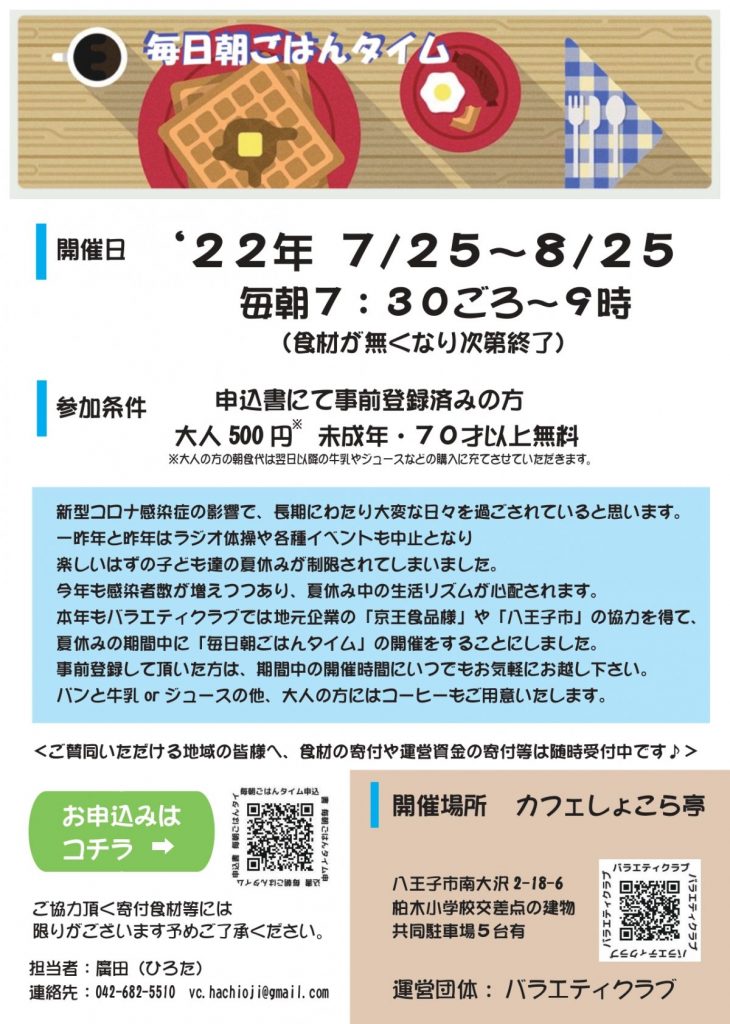 ボランティア団体バラエティクラブは、今年も、夏休み毎朝「毎朝ごはんタイム」を開催いたします。「朝ごはんタイム」はどなたでも(登録制)ご利用可能です。お子様、孤食・独り暮らしの方や学生さんなど、お待ちしております。 ※前日夜の準備、早起きお... -