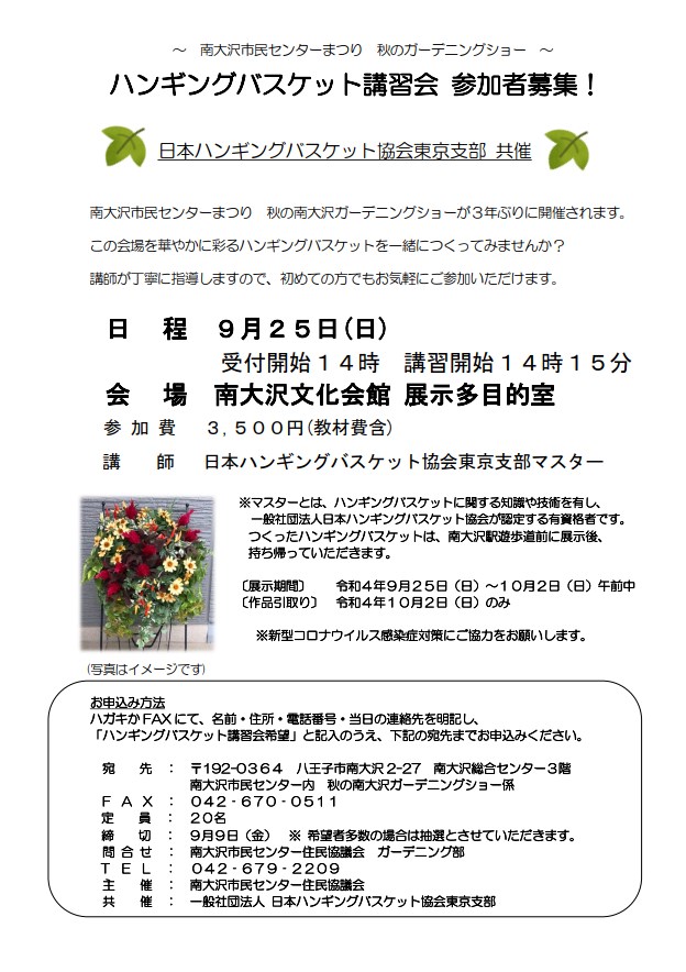 南大沢市民センターまつり展示~ハンギングバスケット講習会 参加者募集!