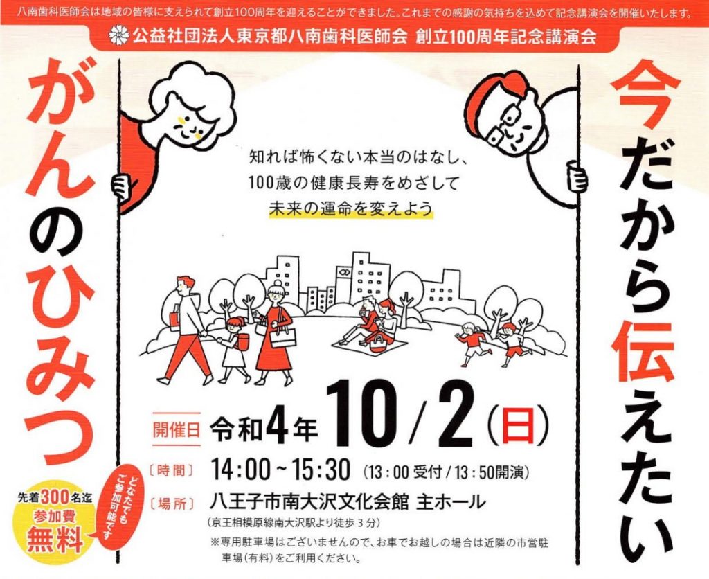 創立100周年を迎える八南歯科医師会による講演会が開催されます。 先着300名様。参加費は、無料です。ご自身もがんを患った経験をもち、放射線治療と緩和ケアのがん専門医である中川恵一先生を講師にお迎えし、100歳の健康長寿をめざすために必要な知識・... -