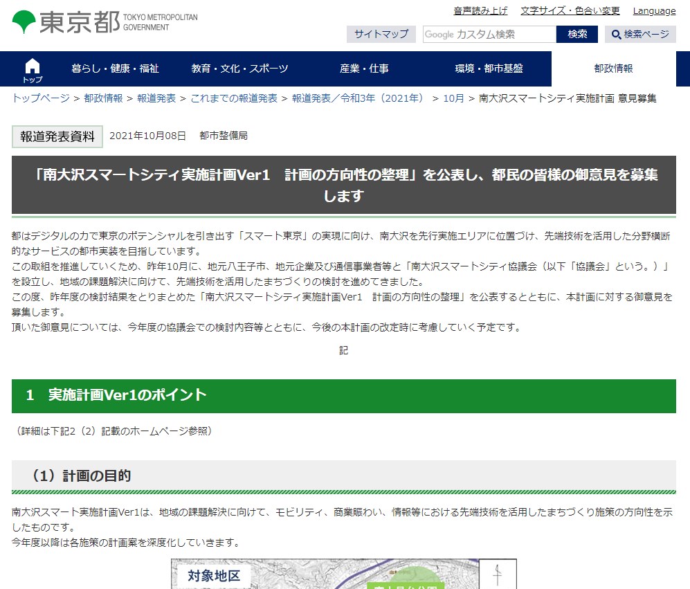 東京都都市整備局は「南大沢スマートシティ実施計画Ver1 計画の方向性の整理」を公表し、都民からの意見の募集を開始しました。次のリンクよりアクセスしていただけます。 https://www.metro.tokyo.lg.jp/tosei/hodohappyo/press/2021/10/08/04.html -
