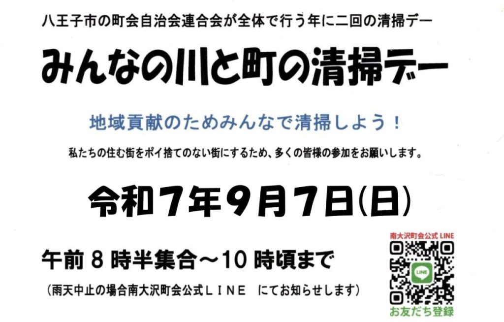 [報告] 9/7(日) 8:30~ みんなの川と町の清掃デーのお知らせ(南大沢町会)