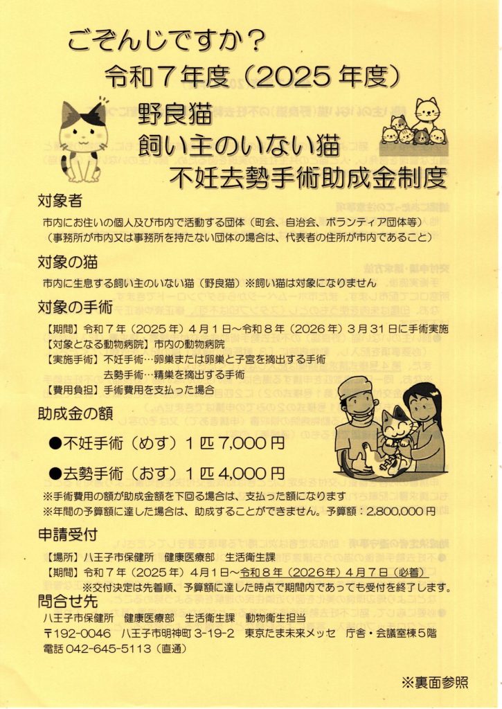 令和7年度 野良猫 飼い主のいない猫 不妊去勢手術助成金制度のご案内(八王子市保健所)