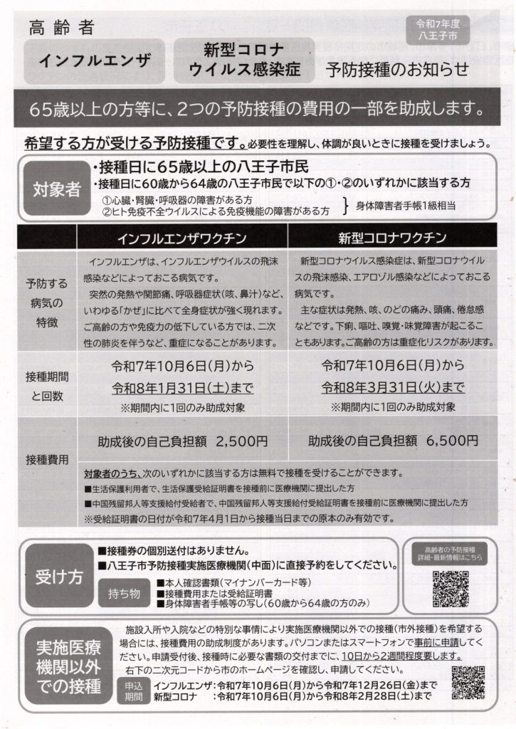 高齢者 インフルエンザ・新型コロナウィルス感染症 予防接種のお知らせ(八王子市保健所)