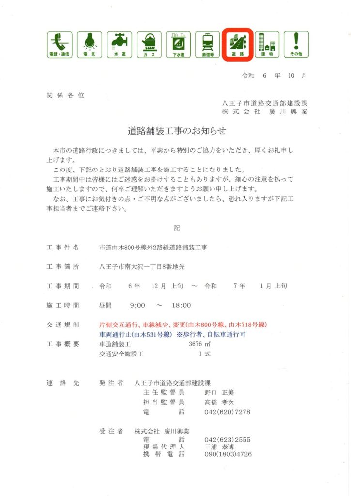 道路舗装工事のお知らせ(市道由木800号線外2路線)(八王子市)
