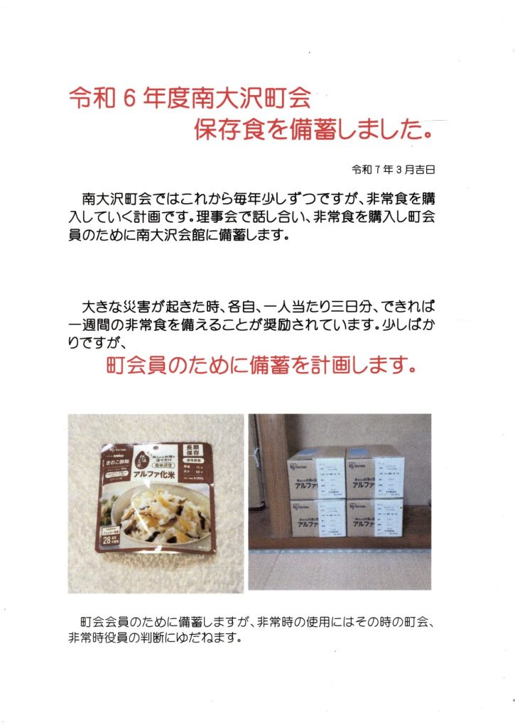 令和6年度 保存食備蓄を始めました 南大沢町会では、これから毎年少しづつですが、非常食を購入していく計画です。理事会で話し合い、非常食を購入し町会員のために南大沢町会に備蓄します。 大きな災害が起きた時、各自、一人当たり三日分、できれば一週... -