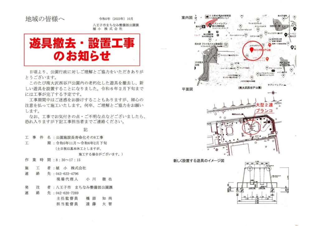 南大沢西谷戸公園内 遊具撤去・設置工事のお知らせ(八王子市)