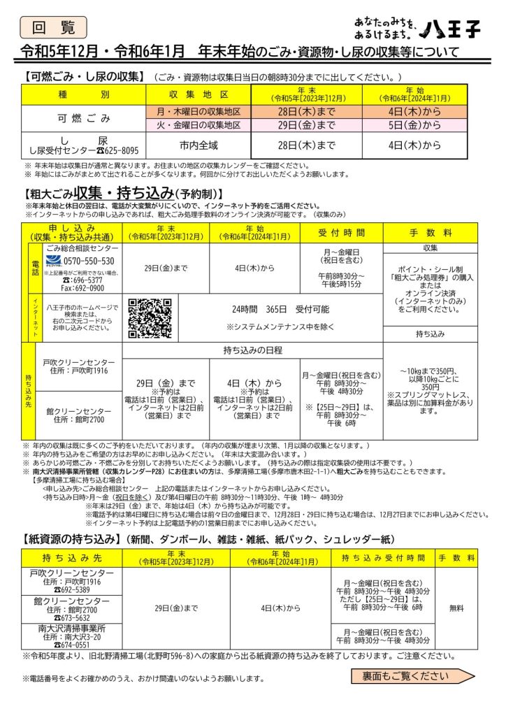 令和5年12月・令和6年1月 年末年始のごみ・資源物・し尿の収集等について(八王子市)