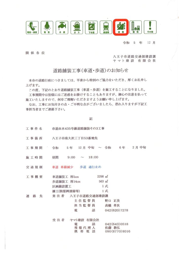 R5.12中旬~R6.2中旬 道路舗装工事(車道・歩道)のお知らせ(八王子市道路交通部建設課)