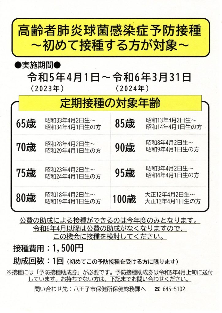高齢者肺炎球菌感染症予防接種の案内~初めて接種する方が対象から(八王子市保健所)