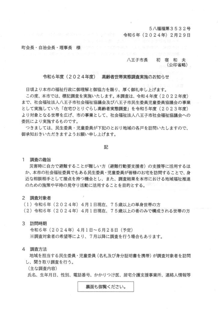 高齢者世帯実態調査実施のお知らせ(八王子市福祉部福祉政策課)