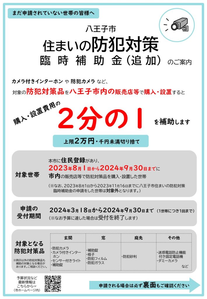 9/30締切 住まいの防犯対策 臨時補助金(追加)のお知らせ(八王子市生活安全部防犯課)