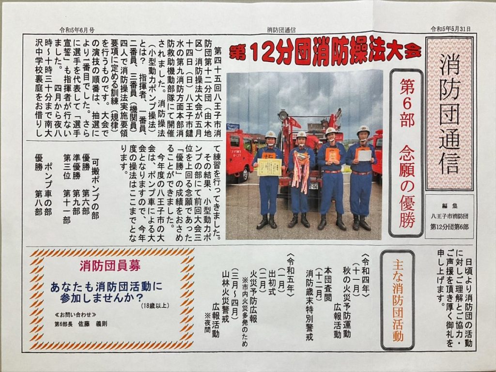 南大沢でご活躍いただいている消防団(第6部)が、第45回八王子市消防団第12分団(由木地区)消防操法大会の可搬ポンプの部で念願の優勝を収めました。おめでとうございます! 第45回八王子市消防団第12分団消防操法大会は、5月14日に八王子市... -