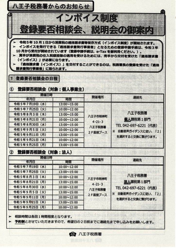 インボイス制度 登録要否相談会、説明会のご案内(八王子税務署)