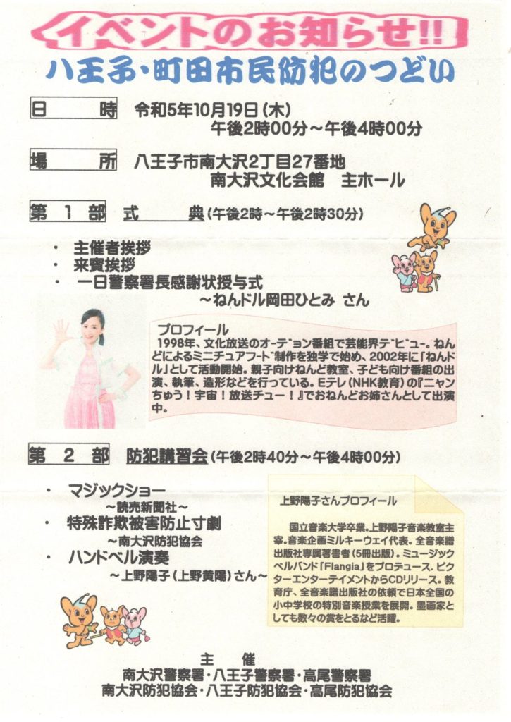 10/19 八王子・町田市民防犯のつどいイベントのお知らせ(南大沢警察署ほか)