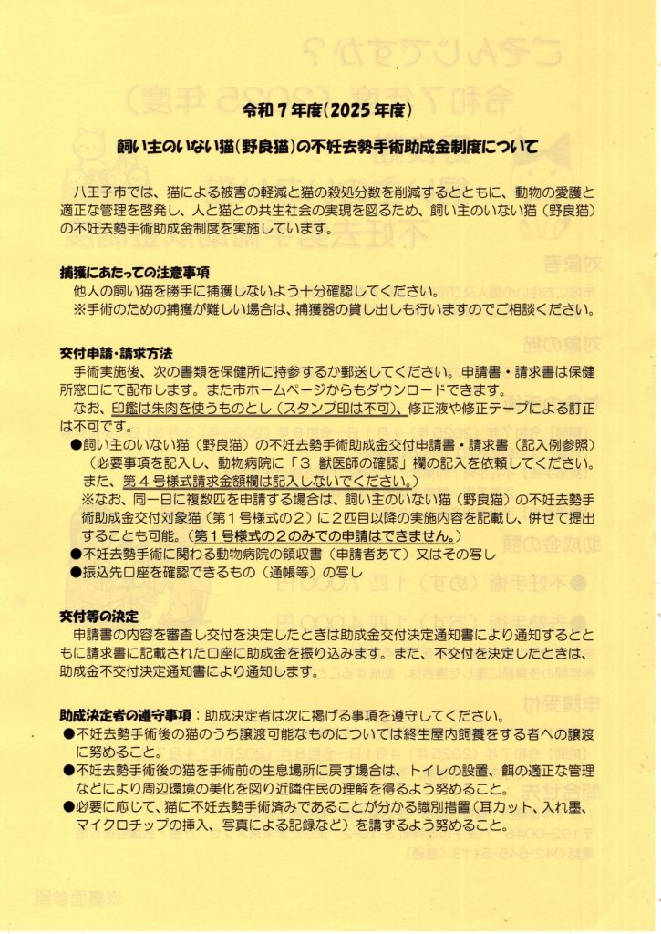 令和7年度 野良猫 飼い主のいない猫 不妊去勢手術助成金制度のご案内(八王子市保健所) 2025 10/14 お知らせ 回覧 2025年10月14日 お知らせ 回覧 よかったらシェアしてね! URLをコピーしました! URLをコピーしました! 高齢者 インフルエンザ・新型コロナウィルス感染症 予防接種のお知らせ(八王子市保健所) 野良猫 飼い主のいない猫に困っていませんか?(八王子市保健所) 関連記事 [募集]町会や地域との関わり方についてのインタビュー(南大沢町会) 2025年10月14日 第60号 自防連だより(八王子市自主防災団体連絡協議会) 2025年10月14日 野良猫 飼い主のいない猫に困っていませんか?(八王子市保健所) 2025年10月14日 高齢者 インフルエンザ・新型コロナウィルス感染症 予防接種のお知らせ(八王子市保健所) 2025年10月14日 199だより 11/9~15 秋の火災予防運動 No.192(八王子消防署) 2025年10月14日 明るい選挙推進協議会のご案内(公益財団法人明るい選挙推進協会) 2025年10月14日 草むら通信 秋 vol.316(NPO法人 多摩草むらの会) 2025年10月14日 11/9~15 秋の火災予防運動(八王子消防署) 2025年10月14日