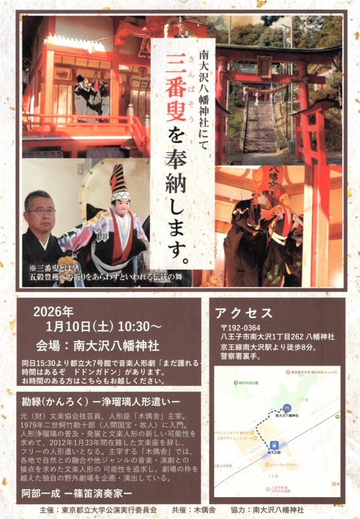 1月10日(土) 10:30~ 南大沢八幡神社にて、浄瑠璃人形遣いの勘禄(かんろく)さんと篠笛演奏家の阿部一成さんにより三番叟(さんばそう)を奉納します。三番叟とは、五穀豊穫への祈りをあらわすといいわれる伝統の舞です。皆さまのご来場をお待ちしております。