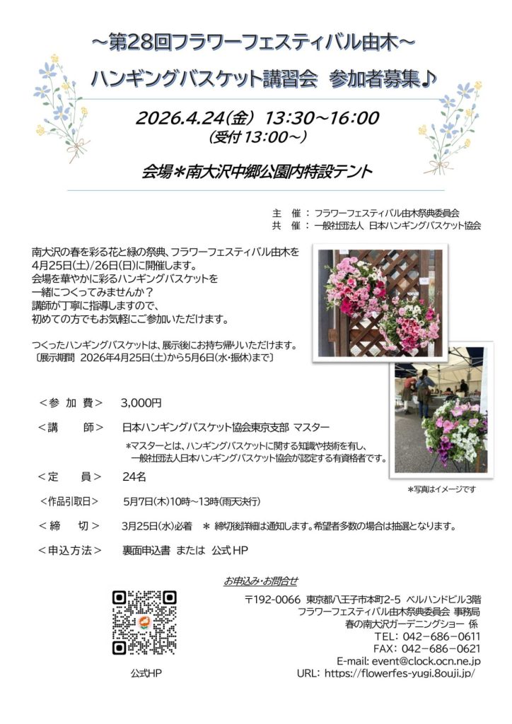 第28回フラワーフェスティバル由木 ハンギングバスケット講習会 参加者募集(フラワーフェスティバル由木祭典委員会) 2026 3/10 お知らせ 回覧 2026年3月10日 応募する(外部サイト) お知らせ 回覧 よかったらシェアしてね! URLをコピーしました! URLをコピーしました! 第61号 自防連だより(八王子市自主防災団体連絡協議会) 3/28~4/5 富士見台公園 桜まつり(西由木コミュニティバーク) 関連記事 3/18(水) 2025年度 大学生ボランティア活動報告会(東京都立大ボランティアセンター) 2026年3月10日 シルバー いきいき新聞/2025年度 新春号(八王子市高齢者あんしん相談センター南大沢) 2026年3月10日 みまもりあいアプリのご紹介(八王子市福祉部高齢者福祉課) 2026年3月10日 3/14 町会・自治会つながりフェスタ2026(東京都) 2026年3月10日 3/26 不登校の子供たちのための体験型学校「高尾山学園」分校設置説明会開催案内(八王子市教育委員会) 2026年3月10日 3/28~4/5 富士見台公園 桜まつり(西由木コミュニティバーク) 2026年3月10日 第61号 自防連だより(八王子市自主防災団体連絡協議会) 2026年3月10日 2/15 joynであそぼ@南大沢中学校のご案内(joynみなみおおさわ) 2026年2月13日